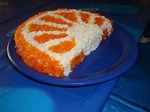 Последним слоем выложить натёртую на мелкой тёрке крупную отварную морковь, майонезом не смазывать. из отложенного белка сделать апельсиновые «прожилки».