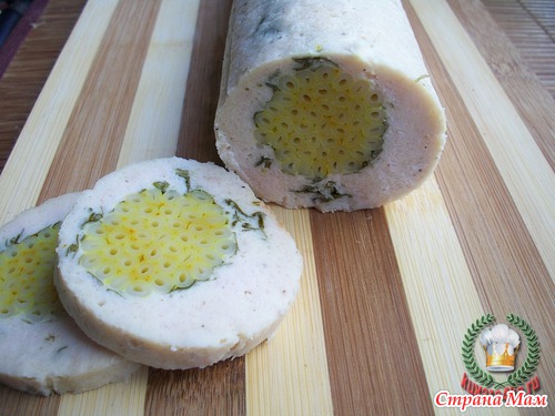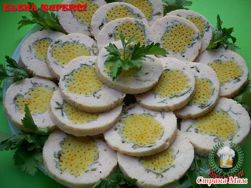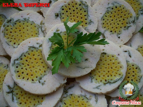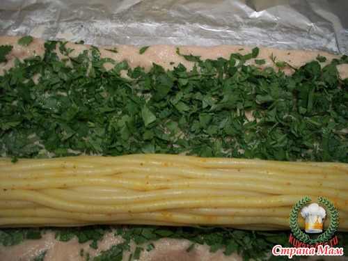 Сверху присыпать зеленью. На край выложить рулет из макарон, предварительно освобожденный от пленки.