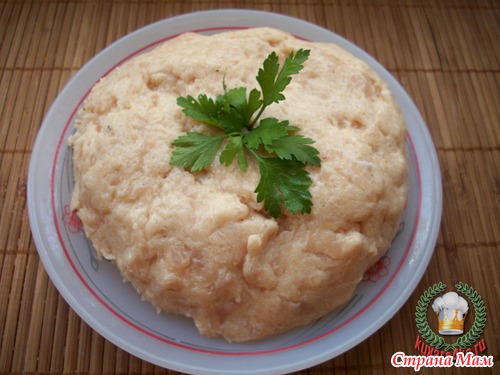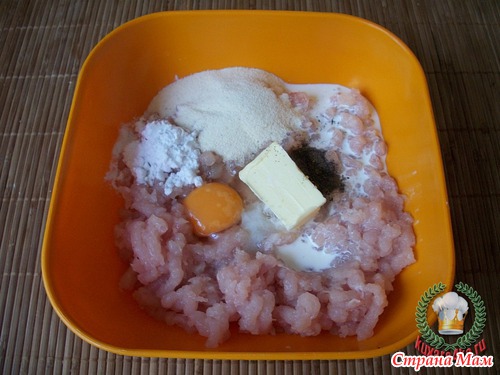 Взбить блендером куриное филе (фарш) вместе с маслом, перцем, солью, яйцом, чесноком. Добавить сливки, крахмал и манку, хорошо перемешать и поставить в холодильник на пол часа, для разбухания манки.