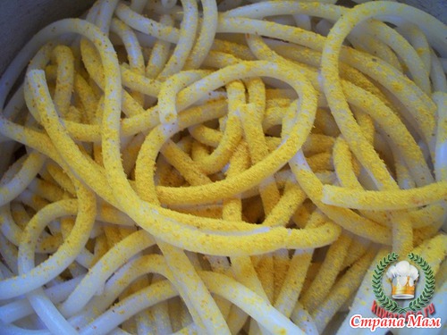 Сварить макароны в подсоленной воде (не разваривать). Готовые макароны перемешать с куркумой.