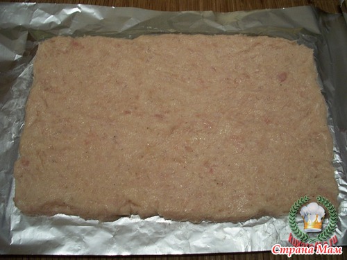 Взять фольгу, смазать ее подсолнечным маслом, на нее выложить прямоугольник из фарша.