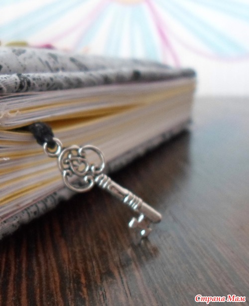 Блокнот с нуля. Мягкая тканевая обложка. Закладка-вощеный шнур+подвеска металлический ключик. Страницы желтые и чисто белые, нелинованы. Некоторые страницы украшены штампами.