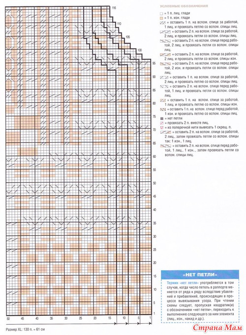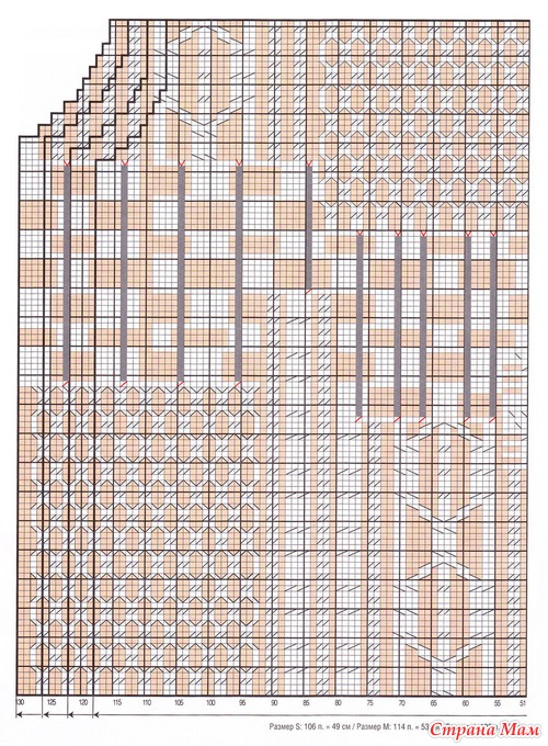 Плотность вязания. Рельефный узор: 20 п. и 24 р. = 10 х 10 см; совокупность узоров: 21 п. и 24 р. = 10 х 10 см.