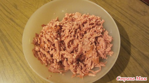 Трем колбасу копченую (п/к) на крупной терке (можно мелко порезать соломкой)