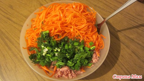 Соединяем колбасу с морковкой по корейски и мелко нарезанной зеленью (укроп, петрушка, зеленый лучок)