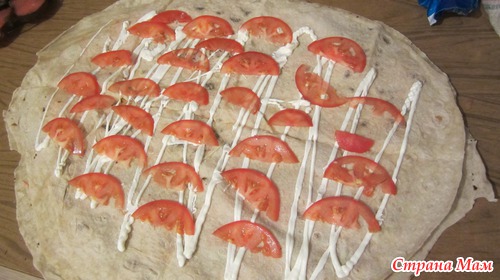 Сверху накрываем вторым лавашом, немного майонеза с чесночком и сверху помидоры