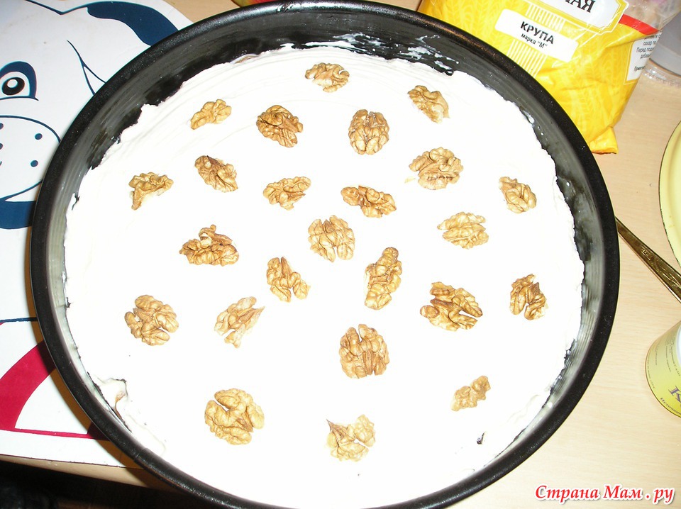 Последняя часть теста - ровняем, смазываем сметаной, украшаем орехами - и в духовку!