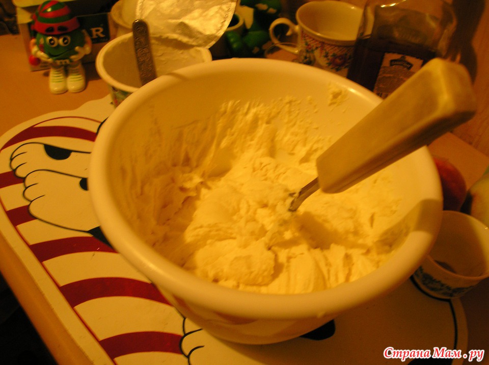 Творог рекомендуют пропускать через мясорубку или протирать через сито. В целях экономии времени (в том числе и на мытье посуды) я беру...толкушку для пюре. Обычную металлическую советскую толкушку, и мну ей творог вместе с сахаром.
