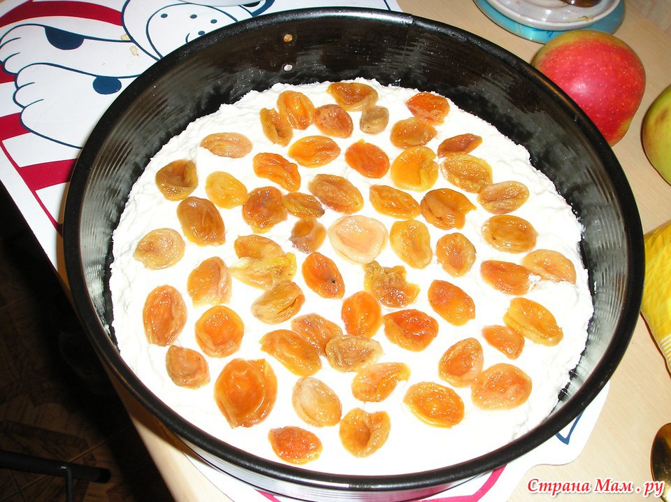Сверху выкладываем 1й слой начинки (у меня-предварительно, минут за 30, замоченная курага)