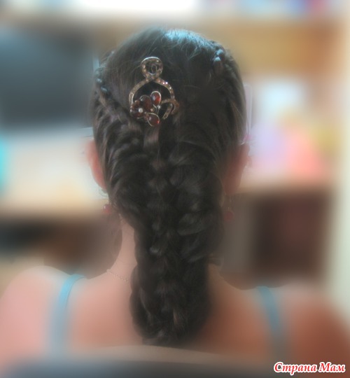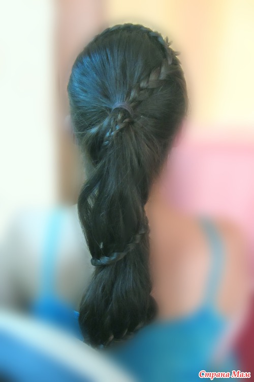 6 - я разделила на 2 части, основную, и частичку около челки, из основной части сделала хвост, начинала плести с челки, французскую косу с захватом с одной стороны, далее ввела ее в хвост, и продолжила на хвосте плести ту же косу по кругу, с захватом с одной стороны, за хвостом плету простую косу, с передней части опять захват. Надеюсь понятно объяснила.