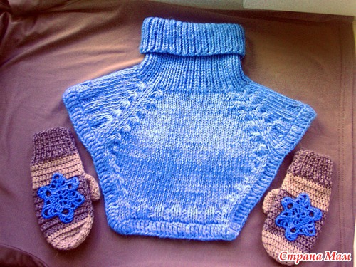 У нас уже совсем похолодало. Утеплила по этому поводу дочку. Связала ей теплый комплект состоящий из шапочки, варежек и манишки.