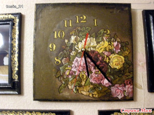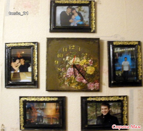 Была у меня задумка сделать на день рождения для бабушки часы-фоторамку с внуками. В процессе долгих мучений вот что у меня получилось. Как обычно не совсем то, что я хотела. В первый раз попробовала кракелюр, есть огрехи но в принципе получилось. Много фото