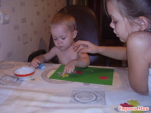 Работать с клеем нам нравится! Но мазать клеем цветочки отказался, мазал сам листочек-полянку, потом старательно клеил цветочки, попутно изучая красный и жёлтый цвет