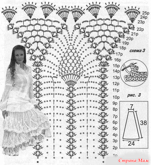 Данная модель сшита из плотной хлопчатобумажной ткани и декорирована кружевными оборками, связанными крючком по схеме 3. Свяжите образец мотива «ананас», отпарьте и с его помощью рассчитайте необходимое число мотивов для оборки каждого яруса. Размеры образца данной модели указаны на рисунке 3. Выполните три оборки из 19, 22 и 23 мотивов «ананас». Отпарьте и пришейте их к готовой юбке в три яруса таким образом, чтобы 2-я и 3-я оборки закрывались предыдущей на высоту 10-11 рядов.