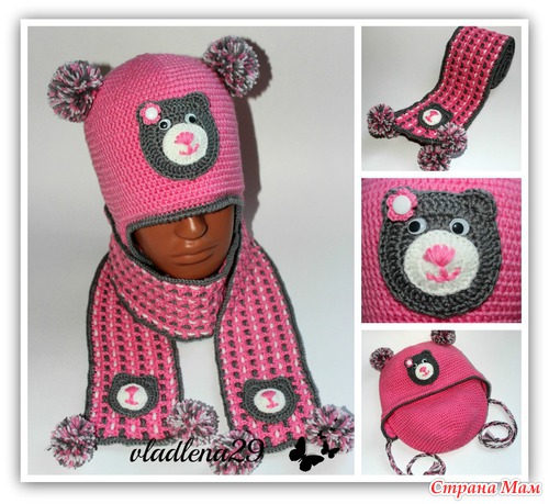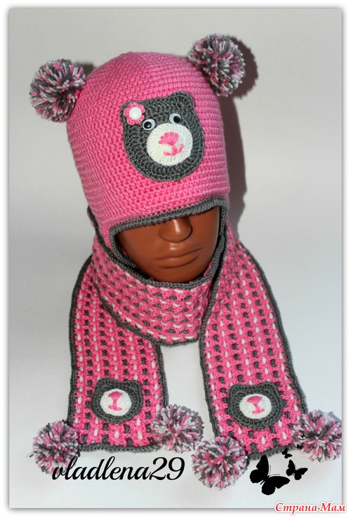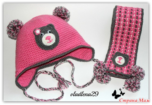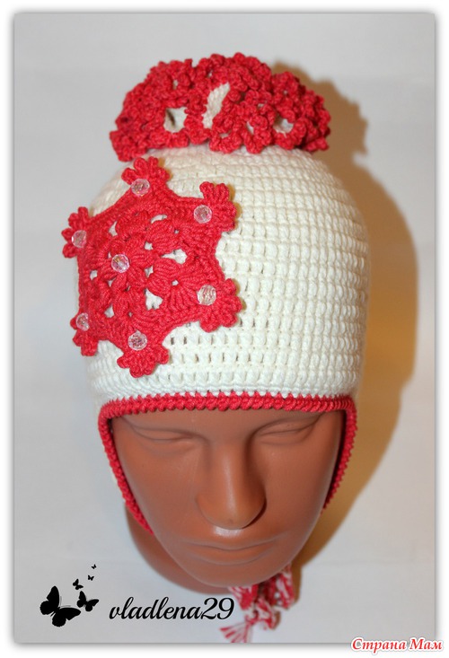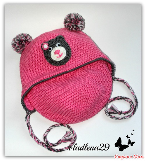 Сделала шапочку двойной, добавила ушки с завязочками и помпон. Получился такой утепленный вариант. А то что-то у нас резко похоладало. И в том варианте было прохладненько.