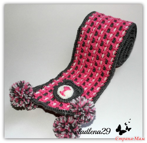 Шарфик связан сеточкой розового цвета, потом прошнурован цепочками из вп серого и белых цветов