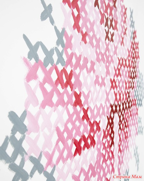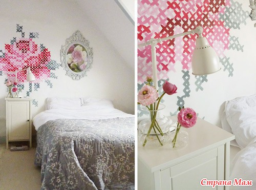 Чтобы воплотить эту идею, вам понадобится белая стена в качестве полотна, увеличенная схема понравившейся вышивки крестиком, акриловые краски и немного вдохновения!