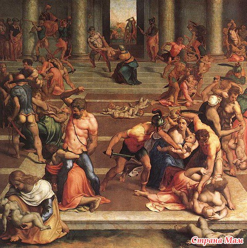 После того, как волхвы, поклонившись родившемуся Спасителя, не вернулись в Иерусалим к Ироду, царь Ирод понял, что его замысел найти Богомладенца с помощью волхвов не провалился, и приказал убить всех детей мужского пола от двух лет и ниже в Вифлееме и его окрестностях. Он рассчитывал, что среди убитых неминуемо окажется и Тот, в Ком он видел претендента на свой престол. «Тогда сбылось реченное через пророка Иеремию, который говорит: "глас в Раме слышен, плач и рыдание и вопль великий; Рахиль плачет о детях своих и не хочет утешиться, ибо их нет", - пишет об этом евангелист Матфей (Мф. 2:17-18).