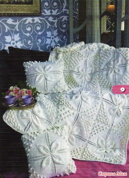 Вот такой изумительный плед нашла в журнале "Susanna", начала вязать, только цвет у меня голубой. Подобные вяжут на осинке. Выкладываю схему, может еще кто захочет связать.