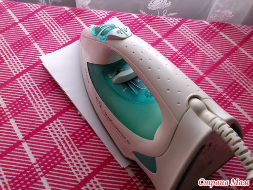И проходимся утюгом. С изнаночной стороны подольше, чтобы пакет расплавился (вот и форма, вот и жесткость), а с лицевой только слегка пройдемся, ну чтобы косячки мелкие исправить.