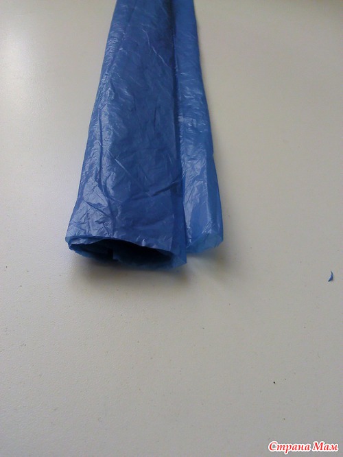 Теперь расправляем пакет и опять складываем таким образом: начиная с одной длииной стороны пакета к другой рулончиком примерно по 4-5 см, но не до конца, оставляя примерно полосу 1,5-2 см, которую мы разрезать не будет. вот так: