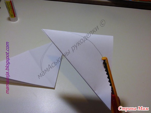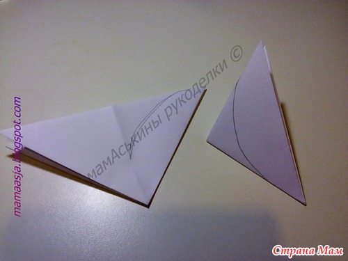 Теперь на треугольнике намечаем линию лепестка будущего цветка не разрезая сторону, которая является центральной частью квадрата
