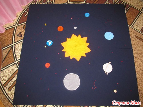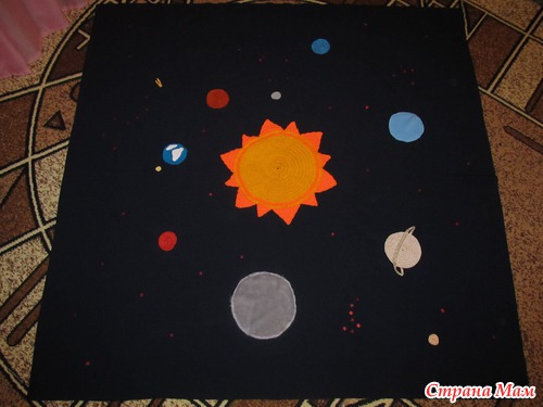 Задали задачку в детском саду сделать космос на ткани размером 1,5 на 1,5. Решила навязать крючком кружочки, т. к. разноцветных лоскутов мало, а клубочков пряжи хоть соли