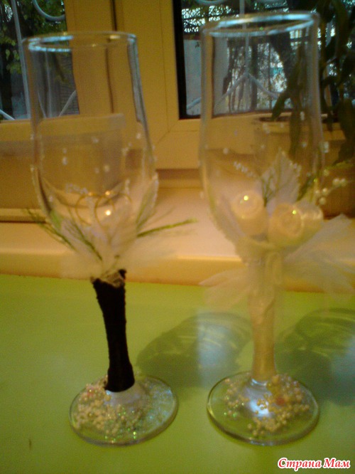 Продолжаем готовиться к свадьбе сестры. Второе наше творение - бокалы для молодых. Использовала 1 бутоньерку, которую разделила 2 композиции - букет на бокал невесты и обручальные кольца на бокал жениха. В закромах бабушки нашлось множество бусин разных размеров и бисер, ими декорировали фон, а ножки бокалов обтянули атласной лентой белого и черного цвета. И напоследок добавили и маленькие веточки из зеленого люрекса-мулине. В общем как-то так. Спасибо, что заглянули )))))