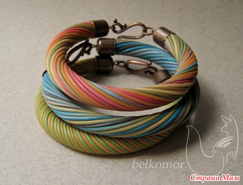 Обратите внимание на качество запекания. Так называемый "недопек" - первоначальное затвердевание глины без полной полимеризации в печи однозначно приведет к порче вашего изделия. Браслеты из данного урока не имеют основы, застегиваются на застежку, стало быть, при надевании используется такое свойство глины, как пластичность. Недостаточно запеченная заготовка разломится сразу или немного погодя. Правильно запеченная - только при многократном грубом выгибании в обратном направлении до упора.