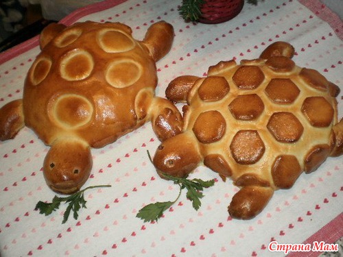 Дать черепахам расстоятся под полотенцем минут 20, смазать яйцом с молоком и выпекать до румяного цвета при 180 градусах.