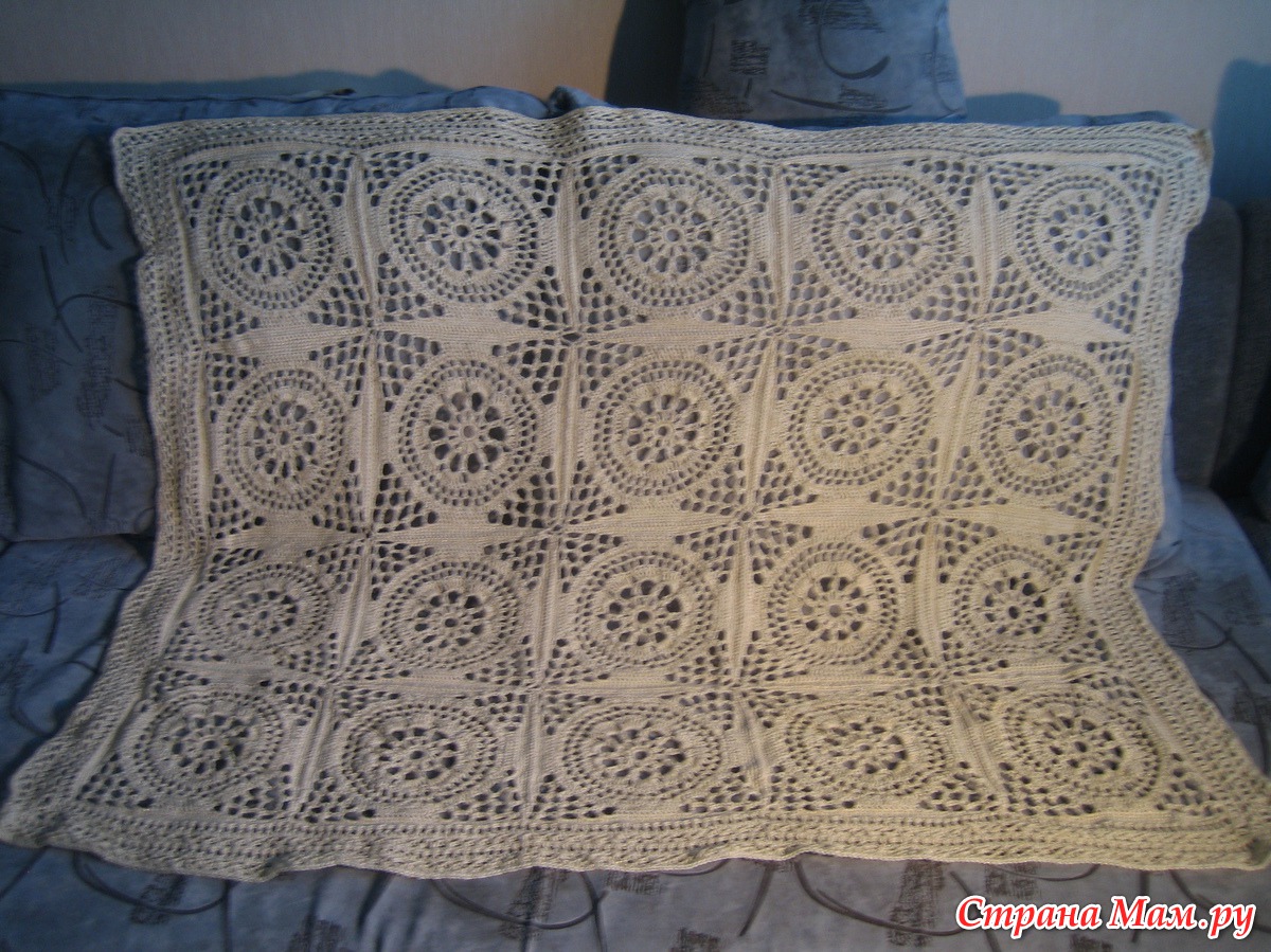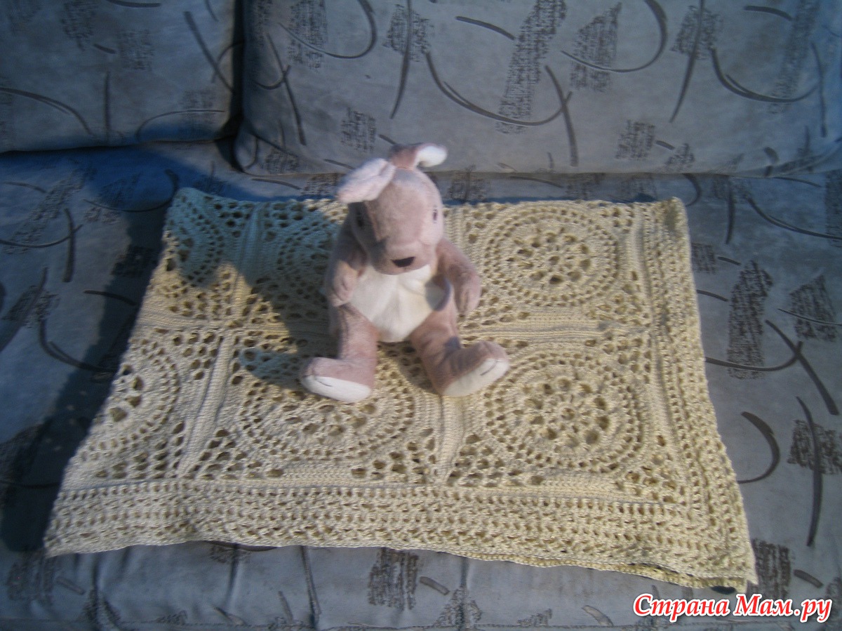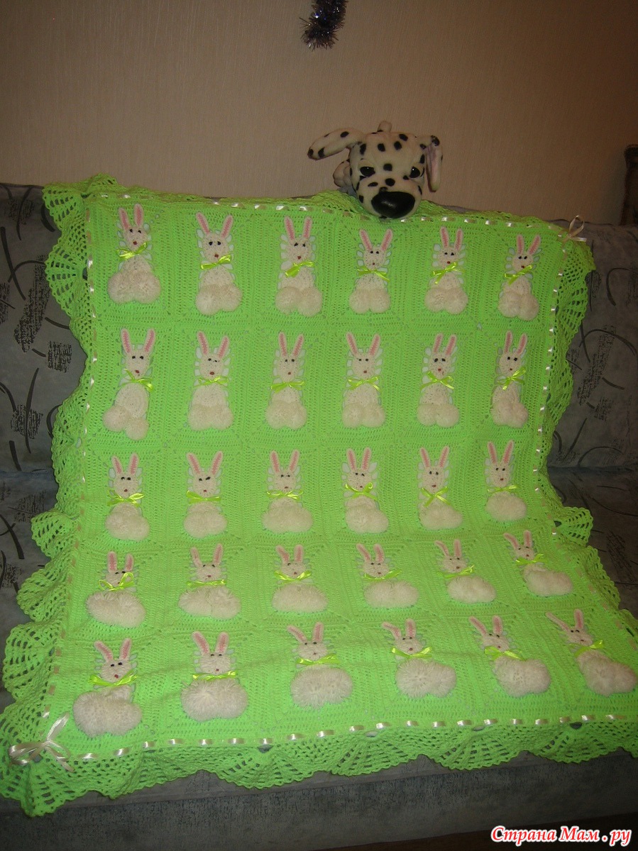 Поэтому я со всей радостью отложила в сторону разные свои рукоделки и начала повязушки детские. Первый заказ был на плед, т. к. связанные недавно зайцы ушли в подарок подруге.