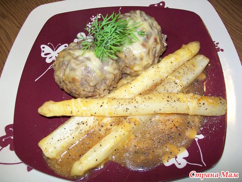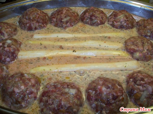 -готовим фарш для тефтелей, катаем крупные шарики и укладываем к спарже