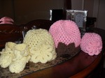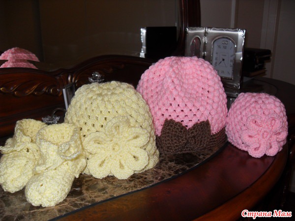Мои первые работы вязания крючком! Самая маленькая розовая шапочка для куколки, желтенькая шапочка и пинетки для доченьки и большая розовая шапочка для мамы!
