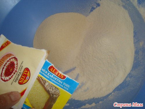 потом смешала муку 1.5 ст и 1 ст манки и разрыхлитель, ваниль