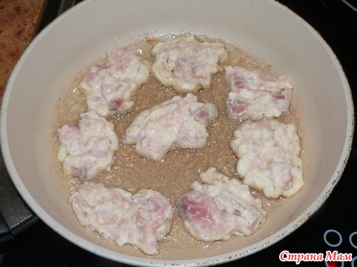 . Все перемешиваем и даем постоять минут 30, потом выкладываем столовой ложкой на сковороду и обжариваем с каждой стороны минуты по 3.