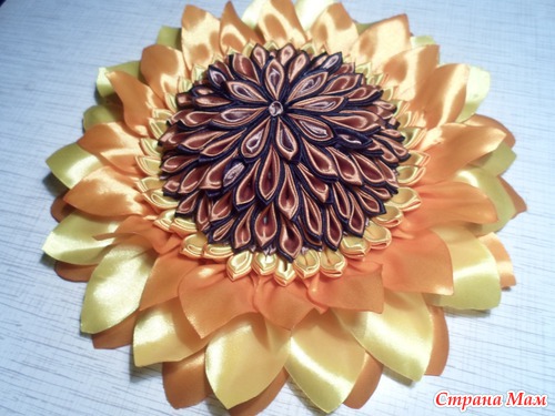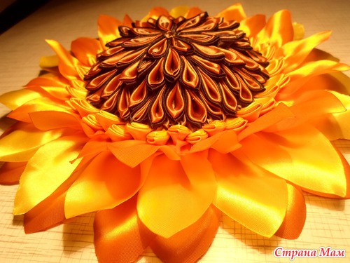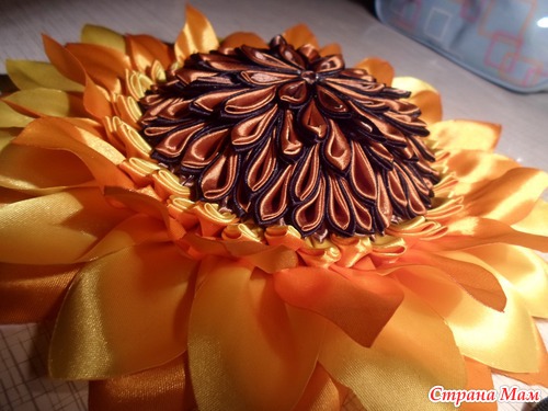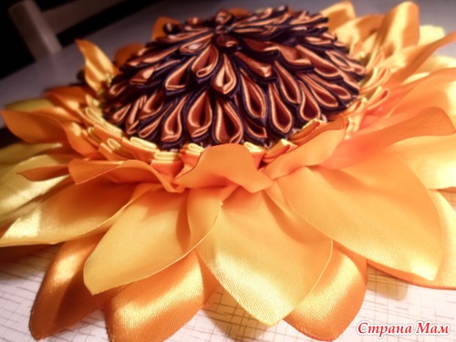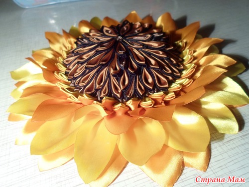 У нас состоялся фестиваль " Две души- две сестры". Каждый район представлял свой цветок. А у нас был подсолнух. Мне поручили ответственное дело- его сотворить. Решила его сделать в технике" канзаши". Его диаметр 25 см. Вот такой он получился обьемный.