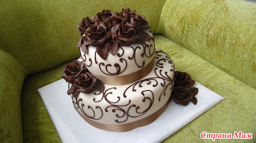 Это мои свадебные... День свадьбы и на разные свадебные даты. С перчиком например, бронзовая свадьба, но хотели именно отметить что жили все эти семь лет в острых отношениях. С красными розами на самом деле был на много лучше, фото не передало цвета золотой ленты в сочетании с кроваво красными розами. Коричневые розы лепила из шокомастики... мне с ней не так просто работать с горячими руками, переодически приходится опускать руки под холодную воду.
