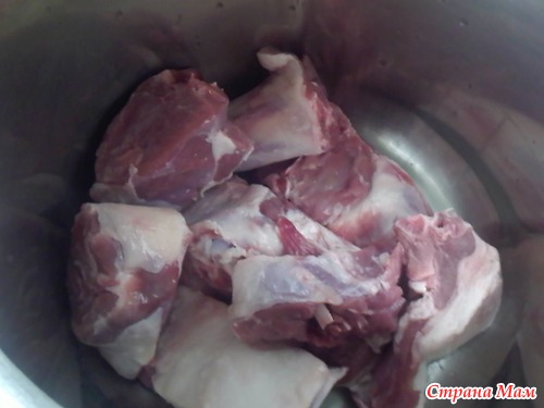 Куски баранины заливаем водой и ставим отварить( как закипит, собрать пенку, посолить, поперчить, бросить луковицу).