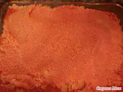 и сразу заливаем горячим бульоном с томатом ( консистенции томатного сока), заливаем столько сколько берет кускус( он впитывает), оставить постоять минут 5.