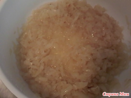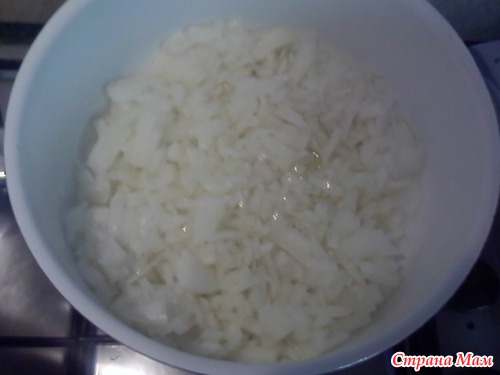 Нарезаем лук( чем мальче- тем лучше)и бросаем в кастрюлю с раскаленным маслом ( лука много и он практически тушится), и до золотистого цвета( лук должен быть мягким).
