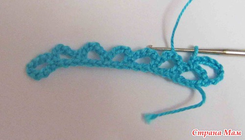 3) Набираем цепочку из 5ти возд. петель, пропускаем 2петли и прикрепляем ее в 3ю петлю сбн. И так вяжем еще пять арок из 5ти возд. петель.