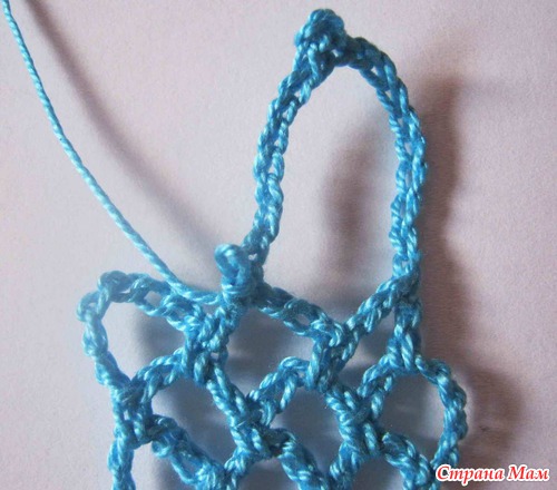 Вяжем цепочку из 12 возд. петель. Полустолбиком прикрепляемся ко второй петле от крючка и вяжем цепочку из 8ми возд. петель, которую прикрепляем к вершине второй арки из 5ти возд. петель.