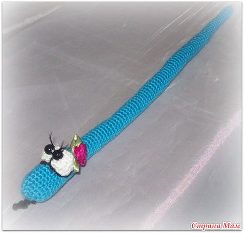 Провязав 7-8 рядов после отверстия которое делали для глазок, вставляем проволоку желаемой длины с петлей на конце и набиваем неплотно.