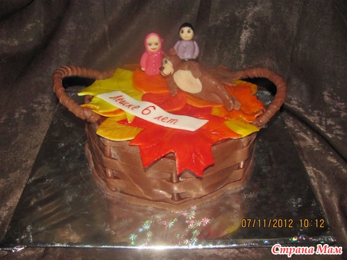 ... Машей и Медведем, и еще Лешей (именинником). Идея оформления полностью принадлежит имениннику. Корзинка - потому что ему нравятся мои корзинки. С листиками - потому что родился осенью. Маша и Медведь - потому что нравится этот мультик. И сам Леша - он же именинник