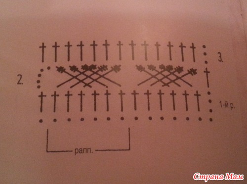 Основной узор. Во втором ряду ССН заменила на столбики с 2-мя накидами.