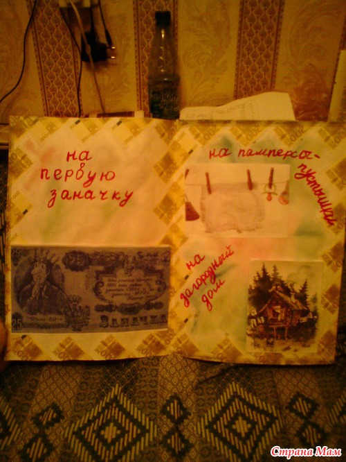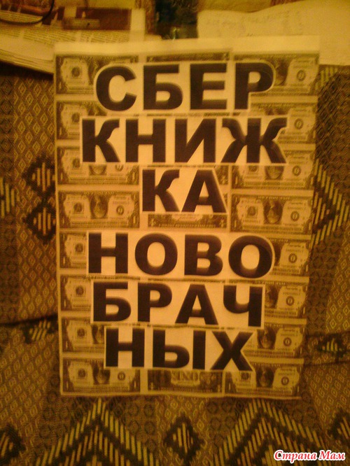 я думала сундучок для денег сделать, но тамада велел сберкнижку, ватман, говорит, сложите пополам и карманы с картинками приклейте на что деньги дарить будут. вот и идея как таковая, это мы ее доделали и модернизировали