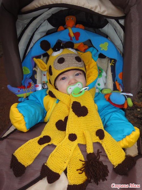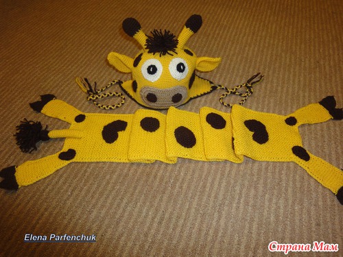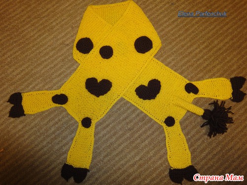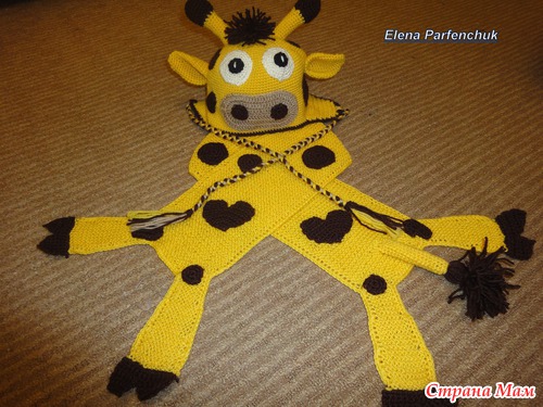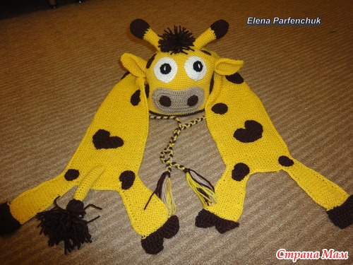 Сначала связалась шапочка, а к ней и шарфик. схему шапочки брала http://www.liveinternet.ru/journalshowcomments.php?jpostid=243350366&journalid=3456926&go=prev&categ=1, а шарфик сама придумала-там легко(основа-платочная вязка, по краям скошенные углы, ножки тоже снизу вверх с убавлением по краям, копыта-3 ряда примерно 12 п/ст, затем 6 п/ст,5 п/ст и заканчиваем 4 п/ст, хвостик крючком-10 полустолбиков прямо, без прибавок, затем кисточка, а пятнышки-как захотите-кружки, овалы, сердечки)
