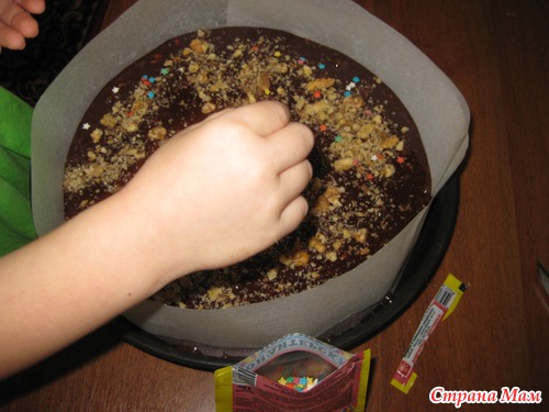 Выливаем нашу уже и так вкусную массу в форму и украшаем по своему вскусу. У нас - орешки и сахарные звездочки.