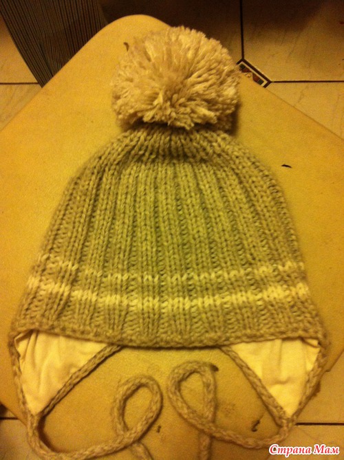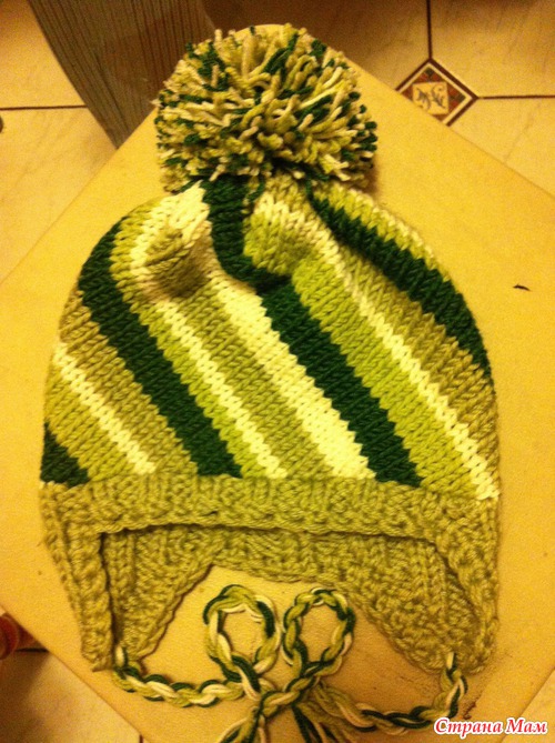 Вяжется просто квадратиком. Спереди косичка или какой нибудь узор, а к вершинкам квадратика пришиваете помпончики, у меня они просто меховые, а так можно любые. Смотрится правда по-детски, но на тот момент было нормально. В этом году связала, померяла, уже не то. Перевяжу.