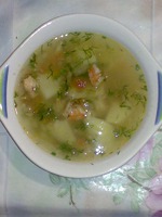 В подсоленной воде отварить креветки. Выложить их, дать остыть. Лук мелко порезать, обжарить на сливочном масле. Бульон процедить через сито, креветки порезать (если большие). Опустить в кипящий бульон нарезанный кубиками картофель. Когда закипит - добавить рис. Минут через 10 - очищенный от кожицы и мелко порезанный помидор. Затем порезанные креветки, лавровый лист. Когда суп будет готов, заправить зеленью укропа.